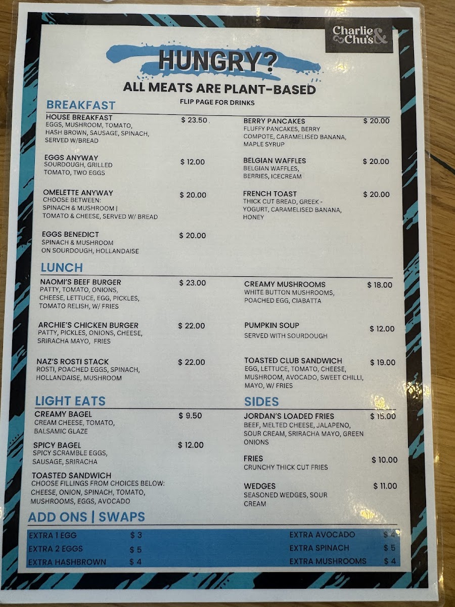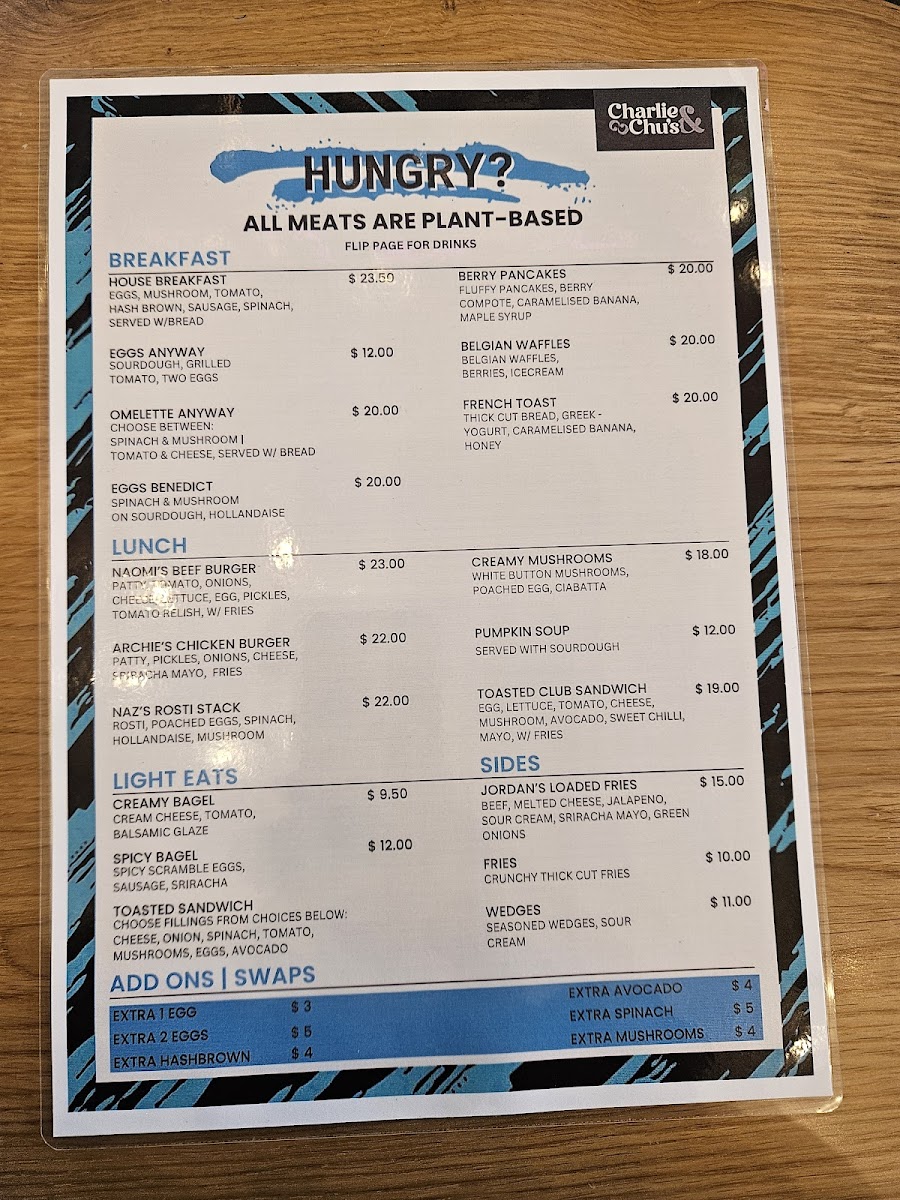 Charlie & Chu’s Cafe specializes in a variety of delicious offerings that cater to all tastes. Whether you're in the mood for a hearty meal or a light snack, the menu is a true reflection of comfort food done right. Sink your teeth into Naomi's Beef Burger topped with fresh ingredients, or opt for the Creamy Mushrooms which are a delight for vegetarians and mushroom lovers alike. If you're feeling adventurous, the Archie's Chicken Burger promises a succulent treat. Don't miss out on the Pumpkin Soup, an ideal option for a cozy lunch or the Naz's Rosti Stack that’s as visually appealing as it is satisfying.